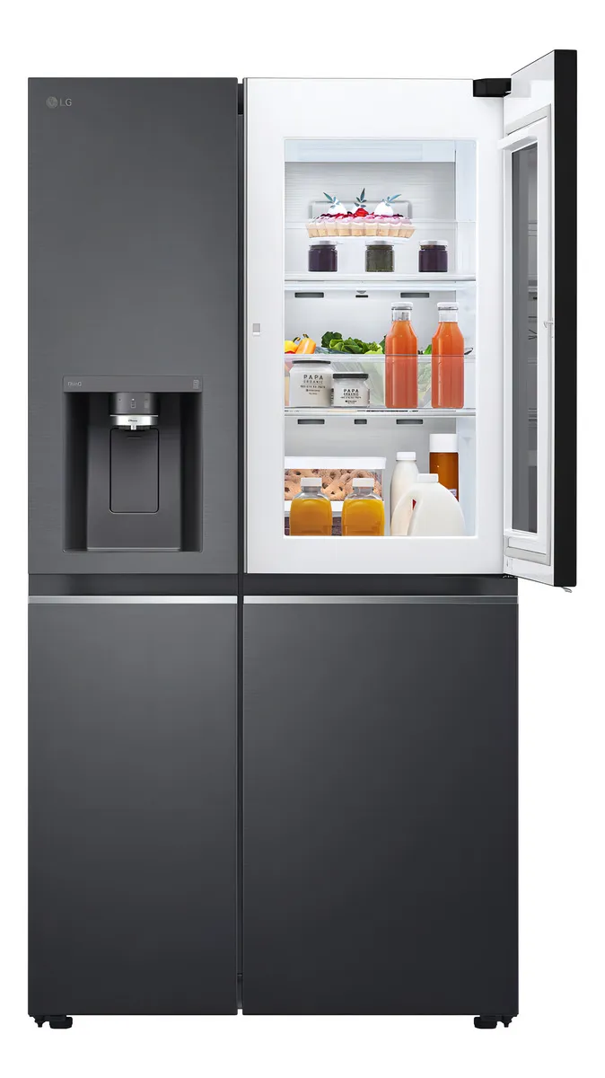La Heladera Inverter LG Side By Side 768L Smart Wifi Instaview es la solución perfecta para quienes buscan funcionalidad y estilo en su cocina. Con una capacidad total de 768 litros, ofrece un amplio espacio para almacenar todos tus alimentos y bebidas, manteniéndolos frescos y organizados. Su diseño en color negro aporta un toque moderno y elegante, ideal para cualquier ambiente.